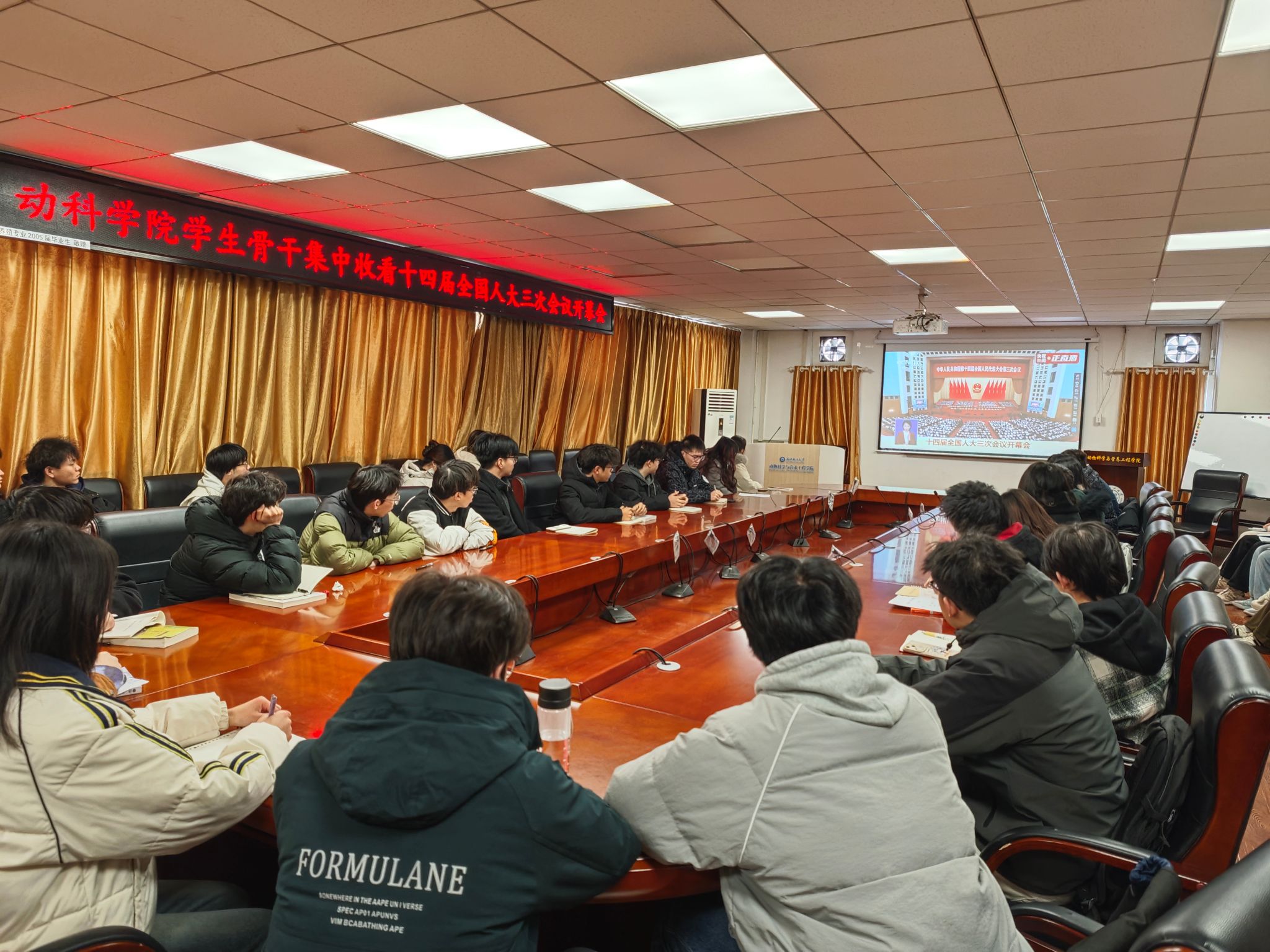 3月5日上午9时,十四届全国人大三次会议在北京隆重开幕。动科学院组织师生在常青校区笃学楼A栋401集中收看大会开幕会盛况,辅导员代表、入党积极分子、团学组织骨干50余人参加活动。