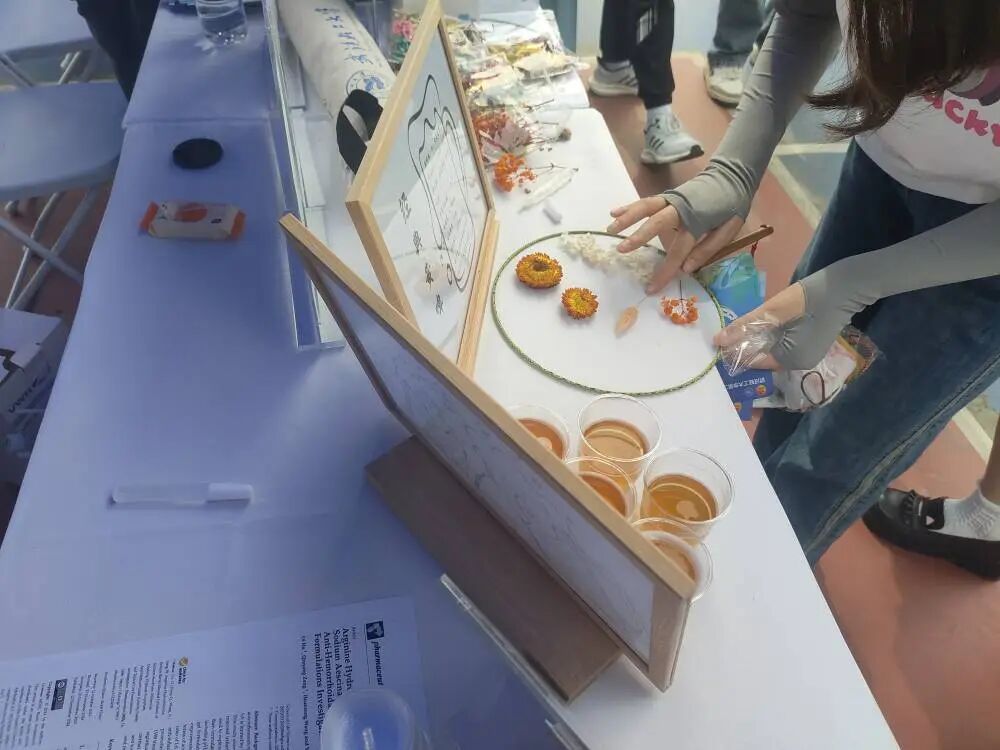 生科学院展区以“生命科学赋能生活”为主线,精心布置了涵盖生物、医药、食品、健康等领域的多样化展品。展台上,生物试剂盒、艾草保健枕、自酿啤酒及特色实物陈列,生动诠释了科研成果向实际应用的转化。其中,微生物培养艺术设计大赛的获奖作品以独特的科学美感吸引众多师生驻足拍照,而生科学院四名学子自主创业的营业执照展示,更彰显了学院对学生创新实践能力的培养成果。