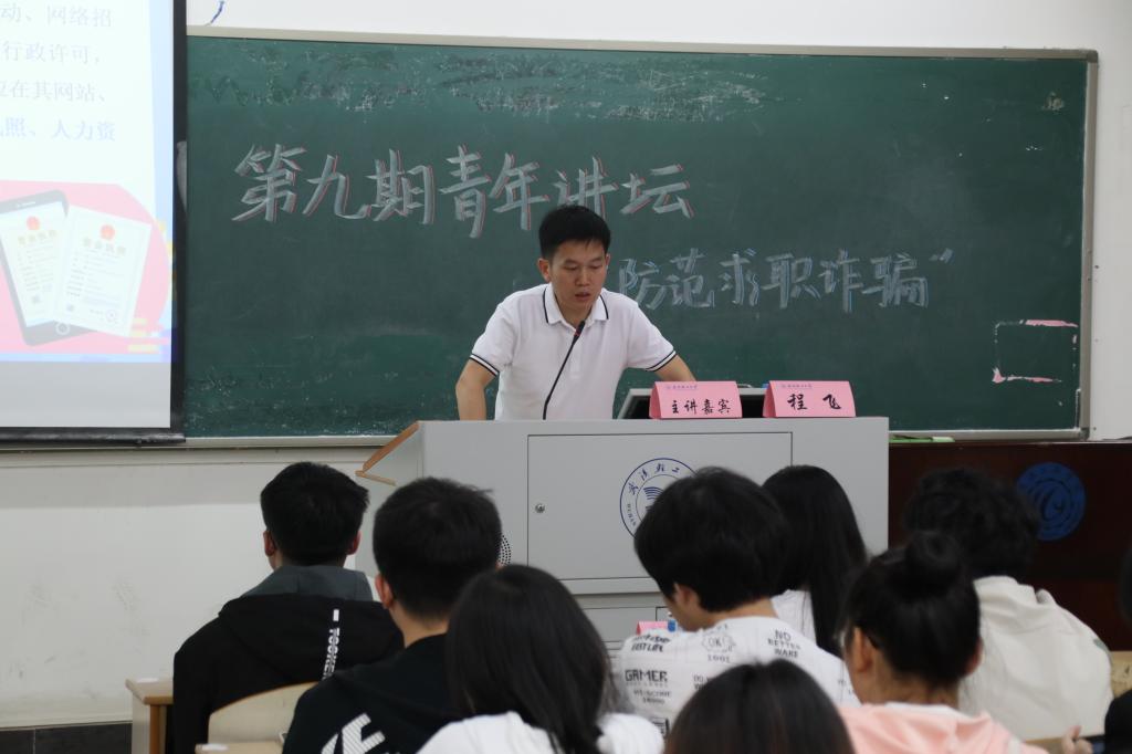 “高薪工作迷人眼,骗局揭穿方知误。”每临近大学生求职时期,总有不少学生被一时利益蒙蔽双眼进而陷入骗局。为加强大学生防范求职诈骗能力,提高个人信息保护意识,2024年4月18日下午2:30,管理学院于文管楼103成功举办了第九期青年讲坛。本期讲坛以大学生防范求职诈骗为主题,邀请湖北清风源律师事务所专职律师、2004级管理学院优秀校友程飞作为主讲嘉宾。活动采取线上线下相结合方式进行,管理学院学生积极参与到此次活动。