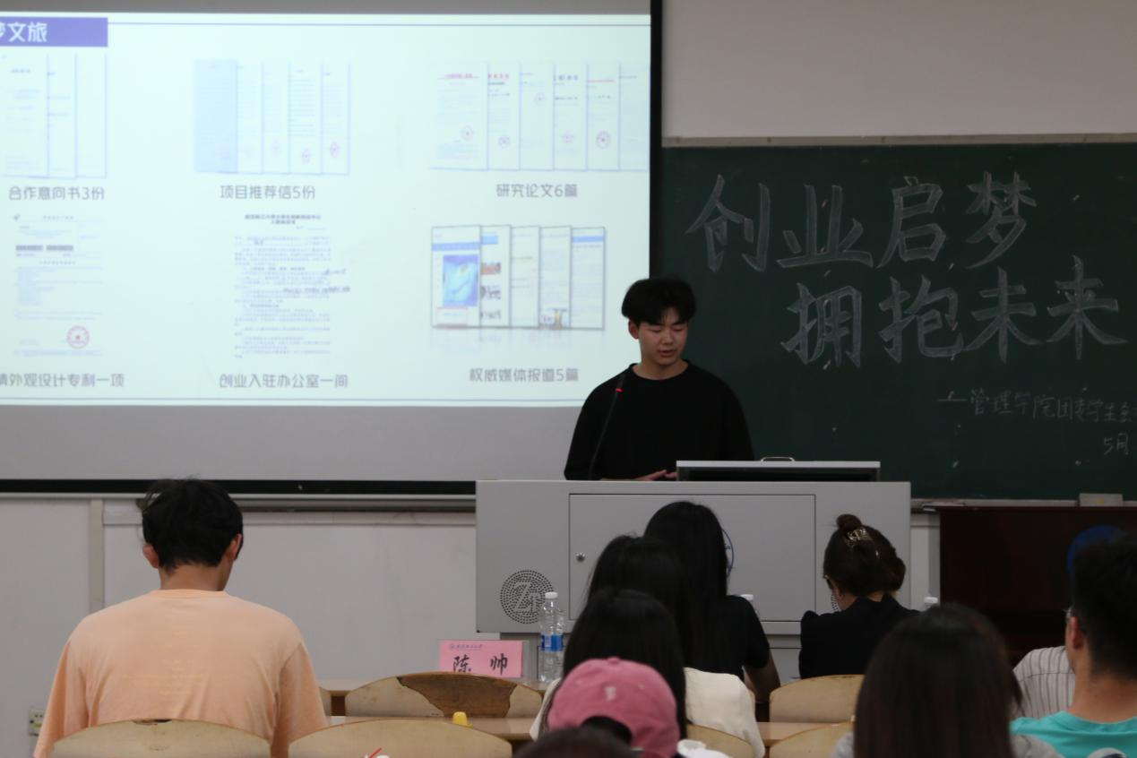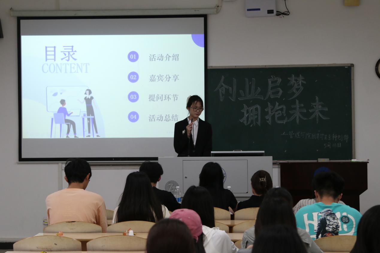 为支持和鼓励同学们勇敢追求自己的创业梦,推动大学生群体不断创新和发展,管理学院于5月16日下午2点在知行楼104教师举办了“创业启梦,拥抱未来”的主题沙龙分享会。本次会议由管理学院学生王溪主持。