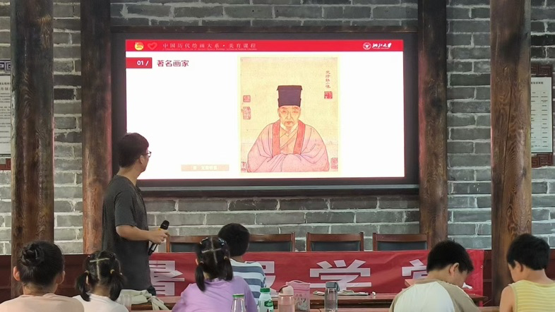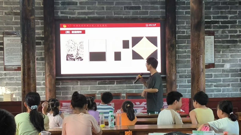 在暑期课堂上,宣讲团成员以满腔热忱与专业素养,引领小朋友们穿越千年时空,漫步于中国古代山水画的瑰丽画卷之中。他们不仅精准剖析了山水画的技法精妙与构图匠心,更深入挖掘了画作背后的人文情怀与文化积淀,让每一幅作品都焕发出新的生命色彩。以明代大家文征明及其《绿荫长话图》为引,宣讲团成员细腻解读了画家如何在笔端倾泻情感,将山川之美与人文情怀交织成为不朽的艺术篇章的绘画过程。通过互动式教学,小朋友们被引导至画作深处,探寻线条的韵律、色彩的和谐与构图的智慧。通过深入浅出的讲述,追溯历史、观照现实,充分激励着课堂学生从传统文化中汲取力量,树立文化自信,成为传承与创新中华文化的中流砥柱。