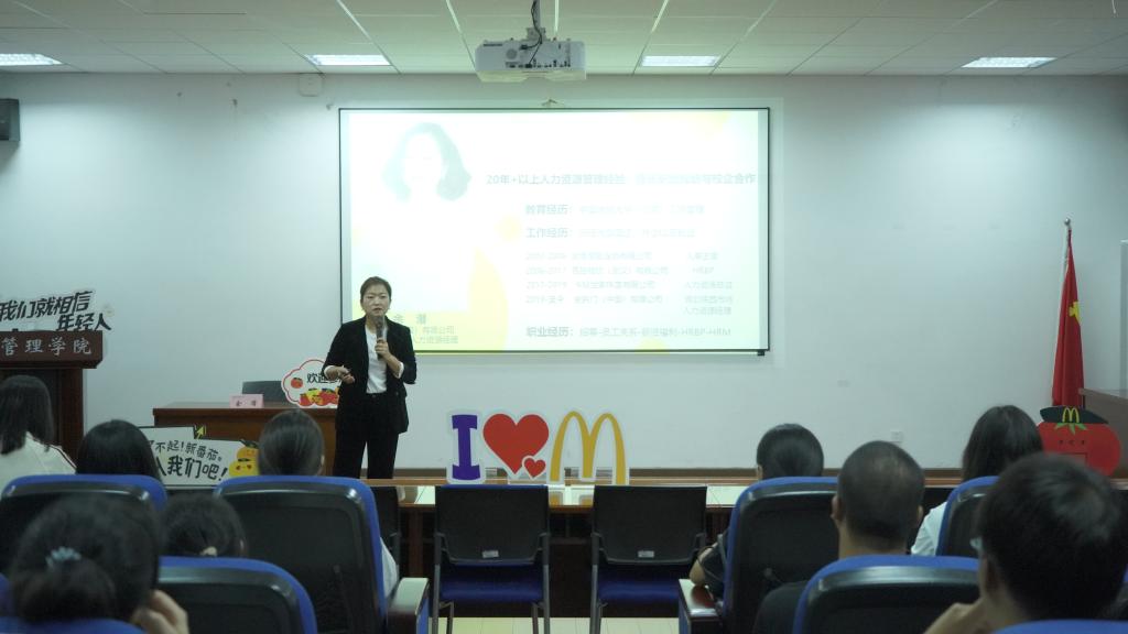 讲座针对麦当劳“青年人才项目”、“菁英管培生”进行了详细介绍。公司品牌竞争力和市场影响力,智能数字化的管理模式,吸引了众多同学的关注,讲座现场,座无虚席,学生们踊跃提问,就管培生选拔标准、职业发展路径等问题与余潜经理进行了深入交流。