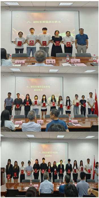 黄猛、张世瑞和李彦锦为院第四届研究生分会主席团及各部门干部成员颁发聘书。