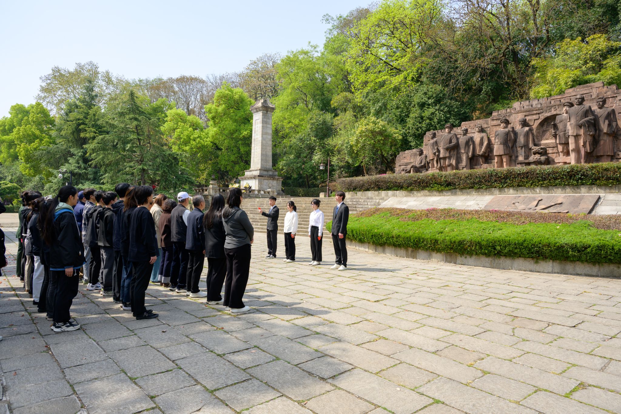 活动中,一行人沿着辛亥先辈的足迹,徒步爬上蛇山,手持菊花来到辛亥革命武昌首义纪念碑前,面向纪念碑鞠躬并默哀。伴着低沉婉转的《献花曲》,武汉轻工大学学工部(处)副部(处)长姚旭与退伍学生缓步上前,向革命烈士敬献花篮。全体成员依次参观瞻仰,敬献鲜花。全体党员高举右拳重温入党誓词。