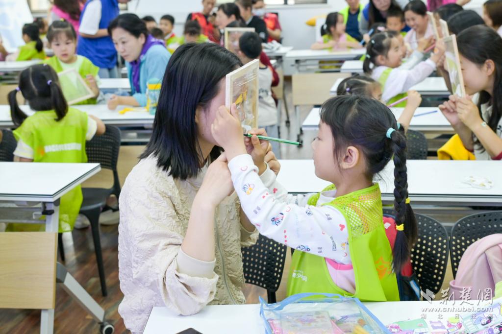 “妈妈的脸圆圆的,头发长长的。”“妈妈像朵花一样,我要在她头上画朵花。”在“妈妈的脸我来画”环节,志愿者在一旁用言语引导,妈妈们举着画框,孩子们叽叽喳喳地叙述着妈妈在自己心中的形象,并在画框上描绘妈妈的样子。
