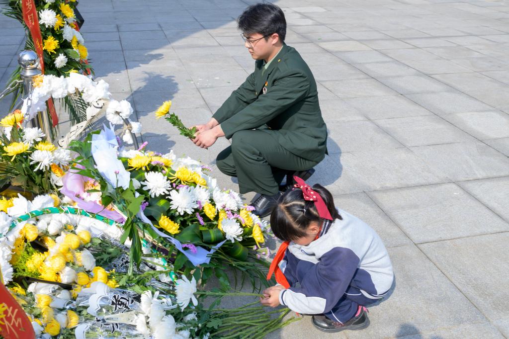 活动伊始,四名退伍大学生身着军装,迈着坚定的步伐缓缓走向烈士纪念碑敬献花篮。全体成员队列整齐,面向纪念碑鞠躬并默哀,表达对革命先烈的缅怀。随后,青年学生牵着小朋友,依次向先辈们敬献鲜花。“哥哥,你的衣服和其他人不一样,但是和我爸爸穿得好像呀!”献花时,顾天蓝小朋友小声询问身旁的大哥哥。“因为哥哥是退伍士兵,你的爸爸是民兵,我们都是国防的后备力量。等你长大了,也可以征兵入伍,和革命先辈一样,和我们一样,为党和国家贡献自己的力量。”王承彦耐心地给她解释道。