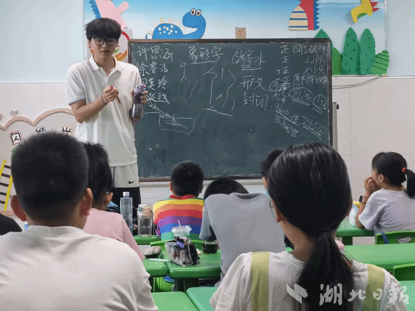 志愿者老师许思涵在课程开始之前在黑板上写了一个象形字“溺”,并且让小朋友们猜测这个字的含义,大家都积极地参与了活动之中,遗憾的是并没有猜到是“溺”字。象形字“溺”左边是一个弯着腰的人,十分虚弱,右边是湍急的河流,意思是一个人沉没在水中,变得十分虚弱。