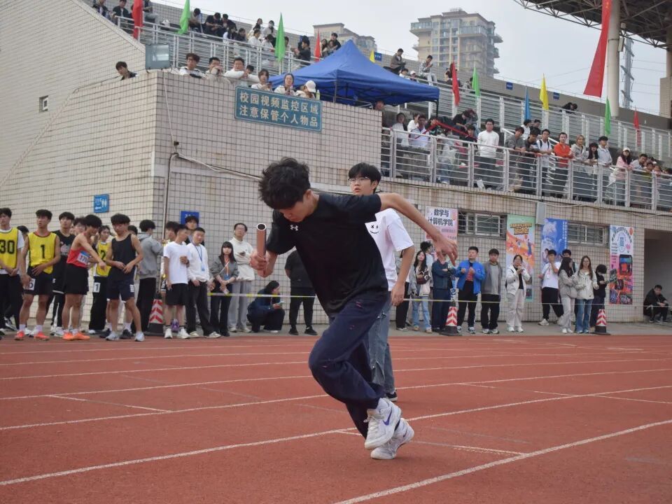 接力赛中,交接棒的瞬间尤为关键。接棒队员提前加速,递棒的队友传递精准,一接一递行云流水,展现了十足的团队默契。