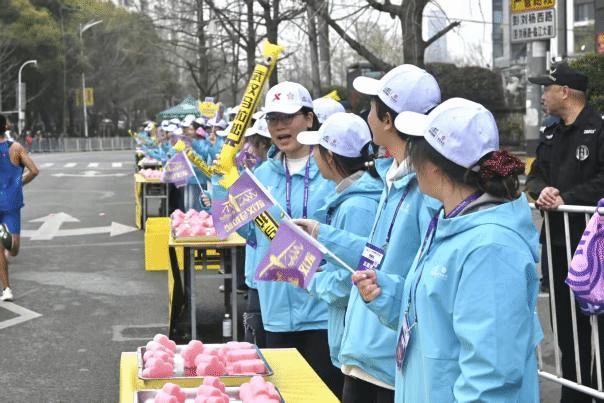 凌晨三点半,志愿者们从学校集结出发,奔赴指定服务点位。清晨时分,当整座城市尚未完全苏醒,全体志愿者已全部到岗。从物资摆放到饮水补给,从能量供应到加油助威,志愿者们分工明确、各司其职,在各自的点位上井然有序地忙碌着。