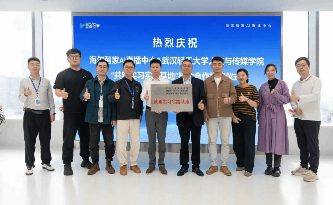 座谈会尾声,校企双方正式达成 “就业实习实践教学基地” 共建意向,并举行挂牌仪式。赵双喜书记与海尔智家 AI 直播中心负责人共同为基地揭牌,标志着文传学院与海尔智家 AI 直播中心的合作迈入新阶段。未来,双方将以该基地为依托,开展学生实习、项目合作、师资交流等多维度合作,既为学生提供 “真场景、真项目” 的实践平台,也为企业输送符合岗位需求的优质人才,实现校企互利共赢,助力企业高质量发展与学生成长成才。